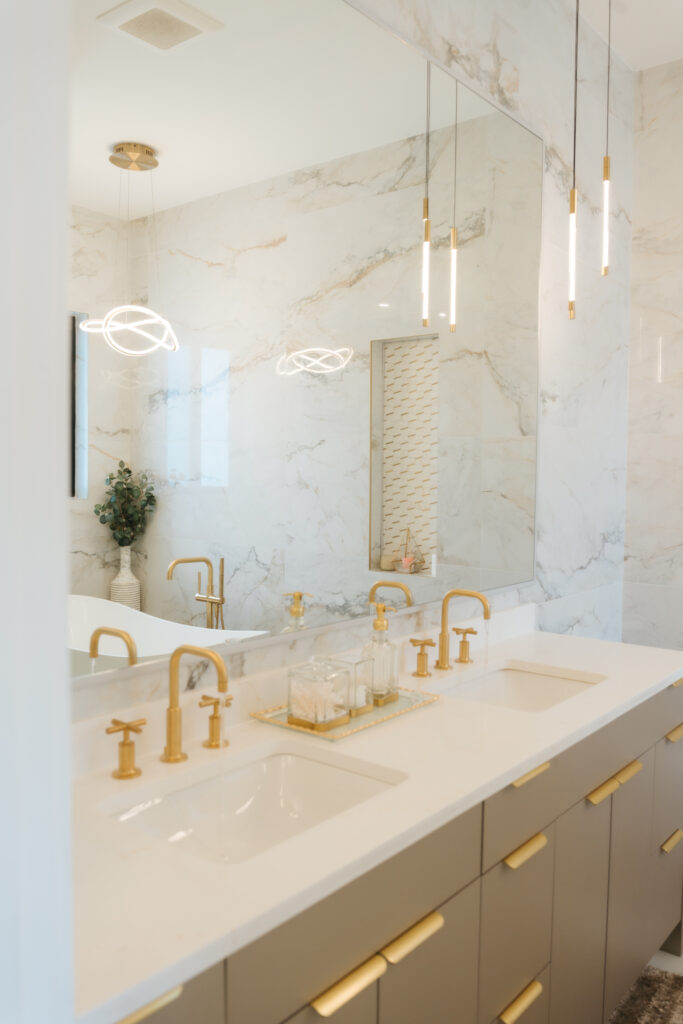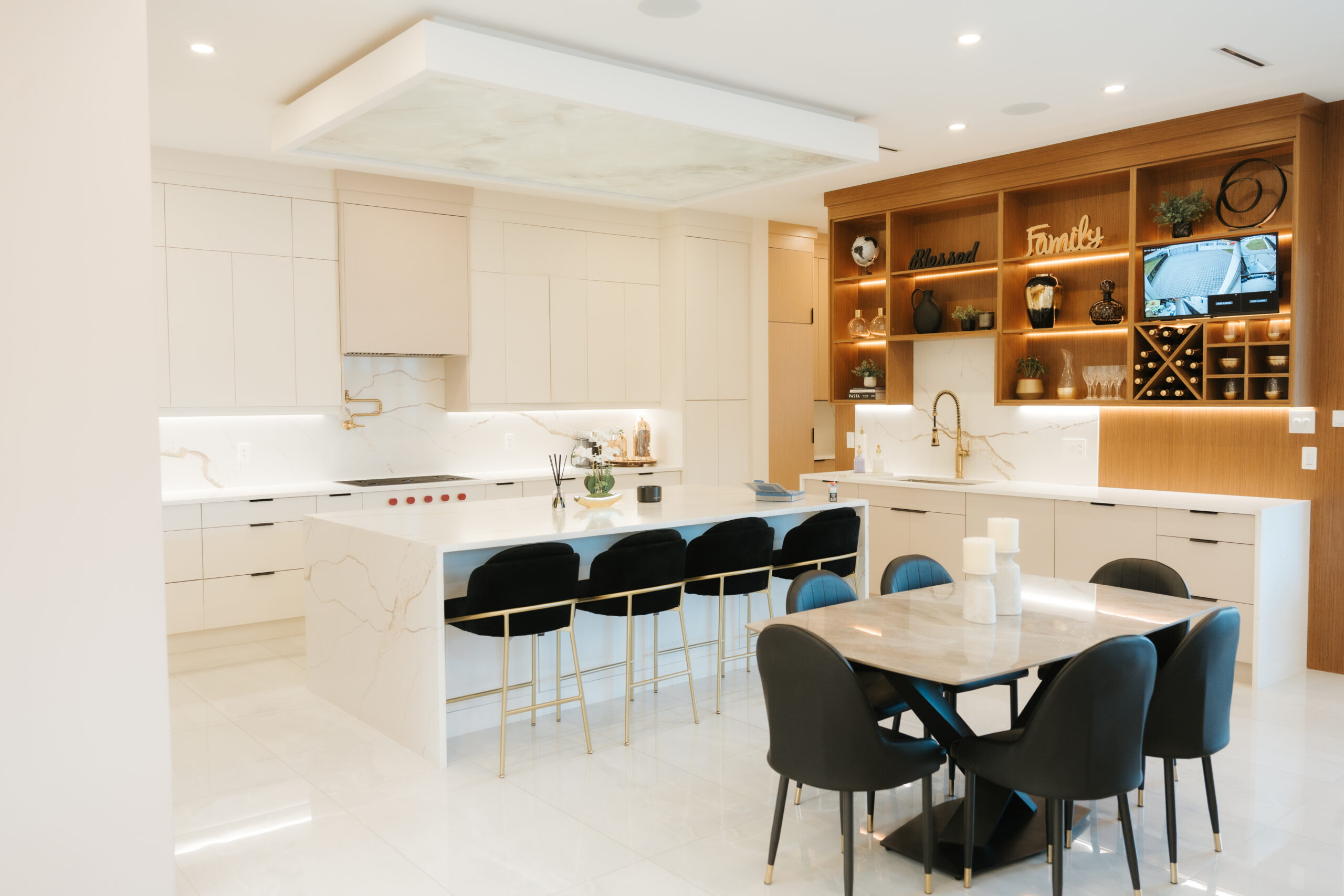 We integrated a large island with sleek black and gold bar stools, offering both a casual dining space and a social hub. The unique light fixture over the island and the open shelving with personalized decor truly bring the entire design together.
