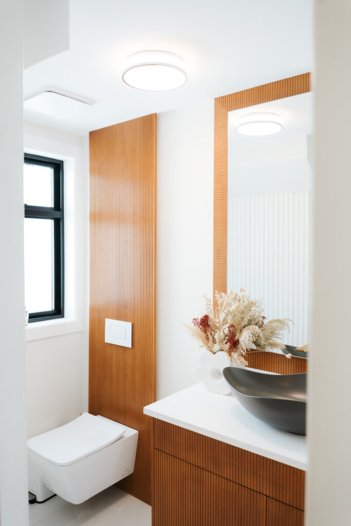Modern design meets warm textures. We transformed this bathroom into a unique and inviting space.